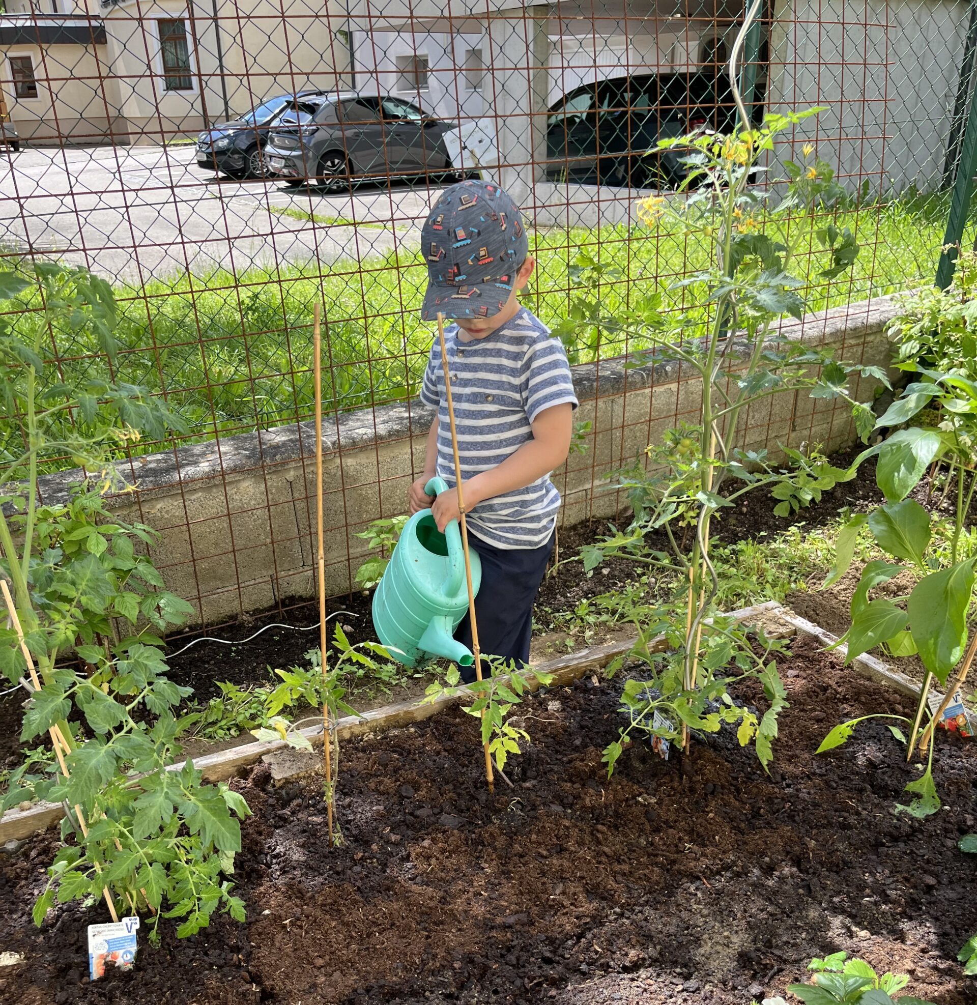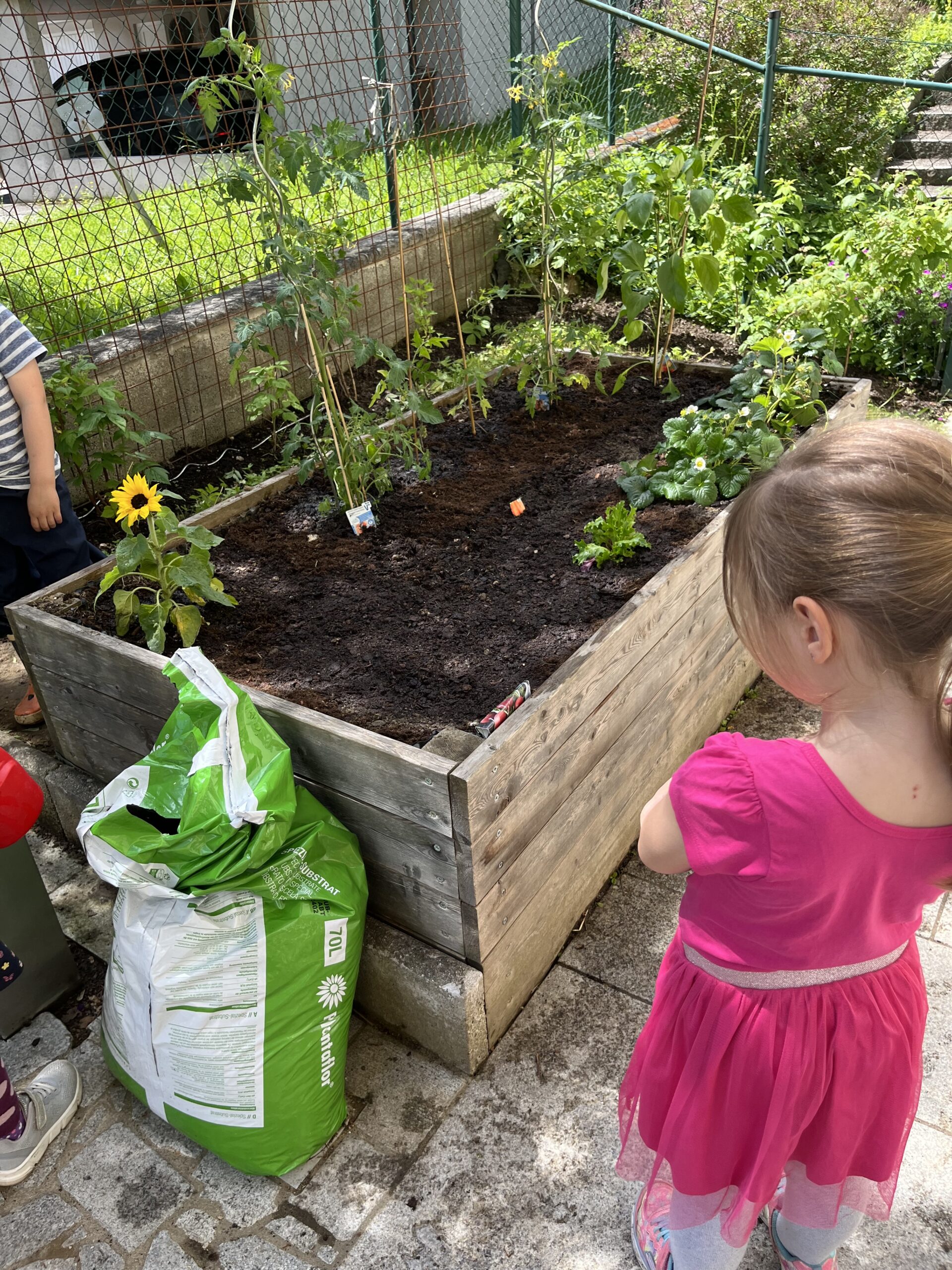 Unsere kleinen Gärtner hegen und pflegen unser Hochbeet und freuen sich auf die Ernte