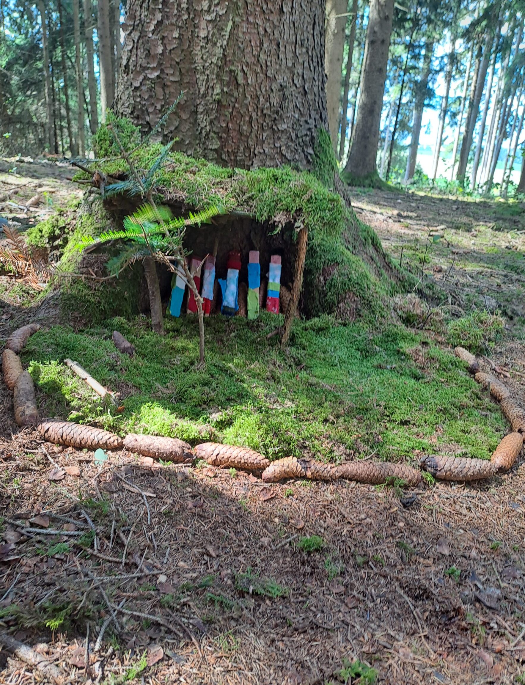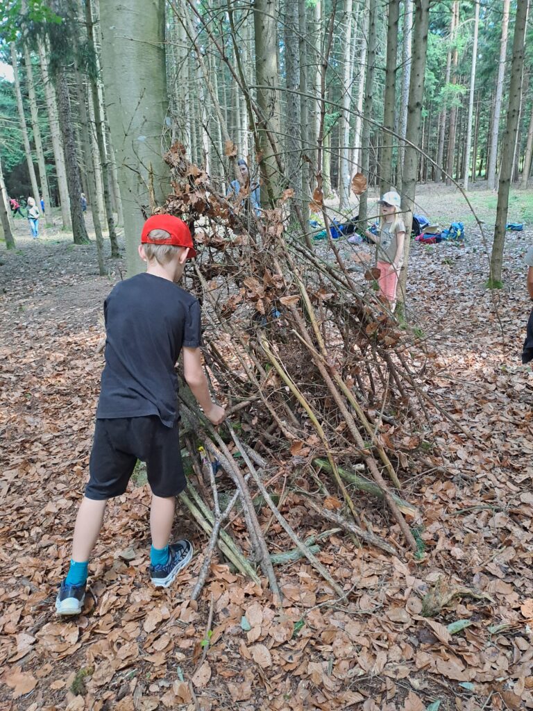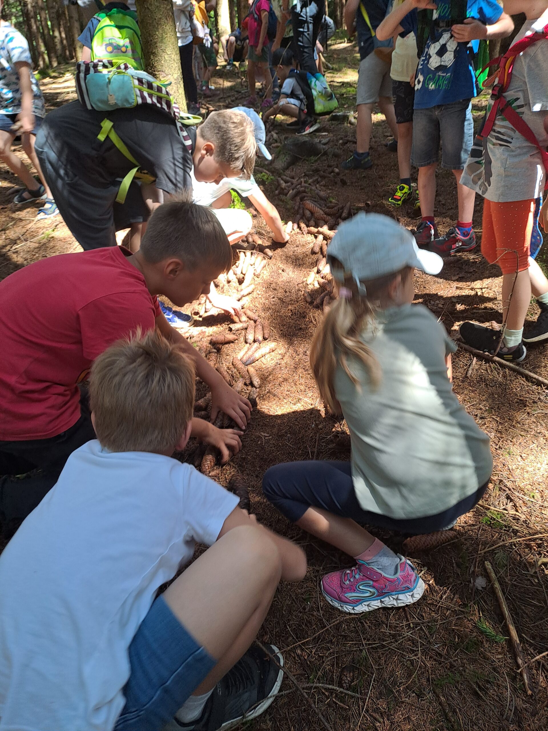 Gemeinsam mit den Schülern sind die Schulanfänger im Wald